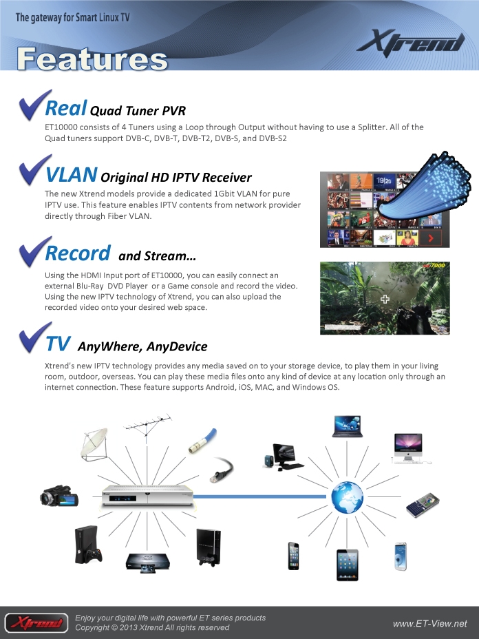 Using the HDMI Input port of ET10000, you can easily connect an external Blu-Ray DVD Player or a Game console and record the video. Using the new IPTV technology of Xtrend, you can also upload the recorded video onto your desired web space.